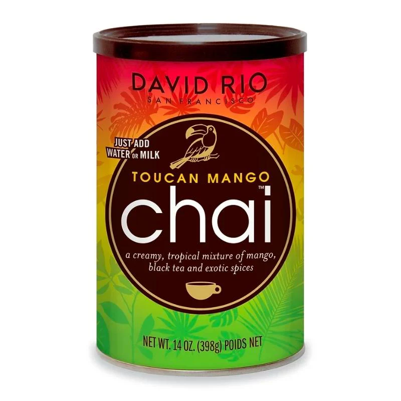 Toucan Mango chai de David Rio es una fresca mezcla tropical de mango, té negro y especias de primera calidad, como la canela y el cardamomo. Delicioso y refrescante con hielo o chai helado, y una excelente opción de chai caliente.